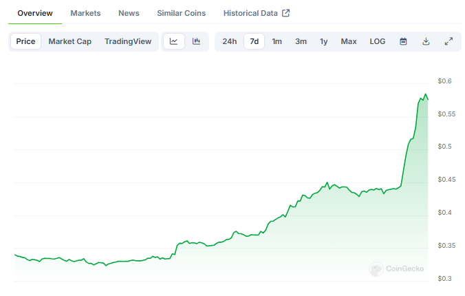 ADA price up nearly 70% in the last week. Source: Coingecko