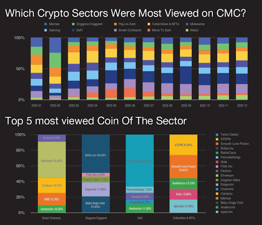 As one of the leading websites in crypto, CoinMarketCap attracts circa 400-700 million visits per month: therefore, they are able to collect data on what coins and sectors people are interested in, and which sectors are seeing the most growth in terms of user engagement and new project listings. CoinMarketCap Research is now able to model this data and summarize the findings to share with you (data as of Dec. 22, 2022):