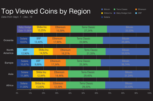 Solana, a cryptocurrency ecosystem that aims to provide many of the same functionalities (and more) as Ethereum, was a top searched coin only in Europe, Asia and Africa — North American and South American users were less interested in SOL. The end of this year saw Solana Breakpoint, the ecosystem’s flagship conference, take place in Portugal, which could account for the increased European interest.
