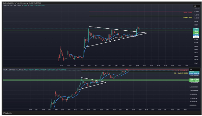 The resemblance of this breakout to Bitcoin’s similar breakout in 2016 is unmistakable. Considering the subsequent Bitcoin price action at the time, the analyst projected a similar move for the XRP price.