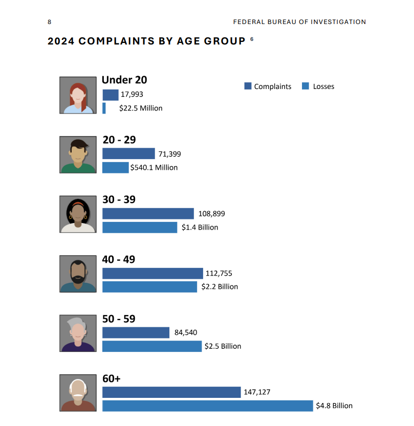 Americans over 60 have become prime targets for cryptocurrency scammers. The FBI report shows that complaints from senior citizens surged 96% in 2024, with 33,36 reports filed compared to 16,96 in 2023. These older victims lost $2.84 billion to crypto fraud schemes, an increase of 71% from the previous year.