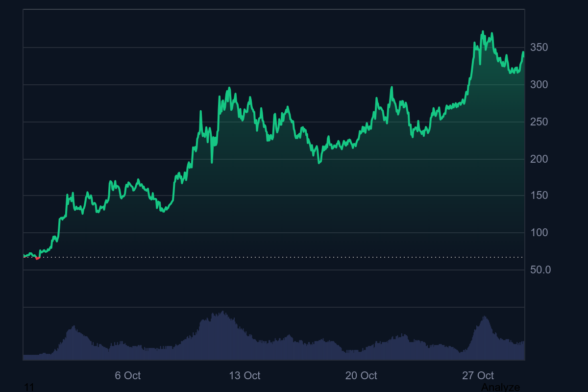 The network’s “shielded supply” reached 4.5 million ZEC, while the token price increased sevenfold, from $50 to over $350 in September.