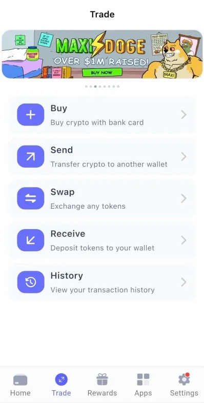 Instead, it only requires you to enter your email address, and you can start trading immediately. After registration, you will find yourself on the wallet’s Home page, but to buy HEHE crypto, you need to move to the second tab on the left at the bottom of your screen, called Trade.