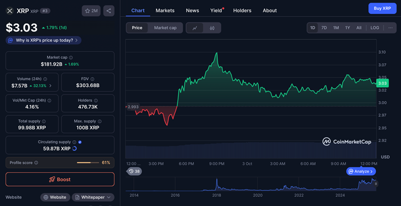 XRP is priced at $3.03 after steady recent trading. Its 24-hour volume stands at $5.78 billion, with a market cap of $178.73 billion and 59.87 billion XRP circulating. Technicals are mixed: resistance levels at $3.20 to $3.50 present major hurdles, and failure to break through could keep XRP locked in a sideways trend.