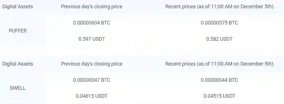 PUFFER and SWELL are available for the BTC market previous day closing price of 0.00000604 BTC / 0.597 USDT and 0.00000047 BTC / 0.04615 USDT respectively.
