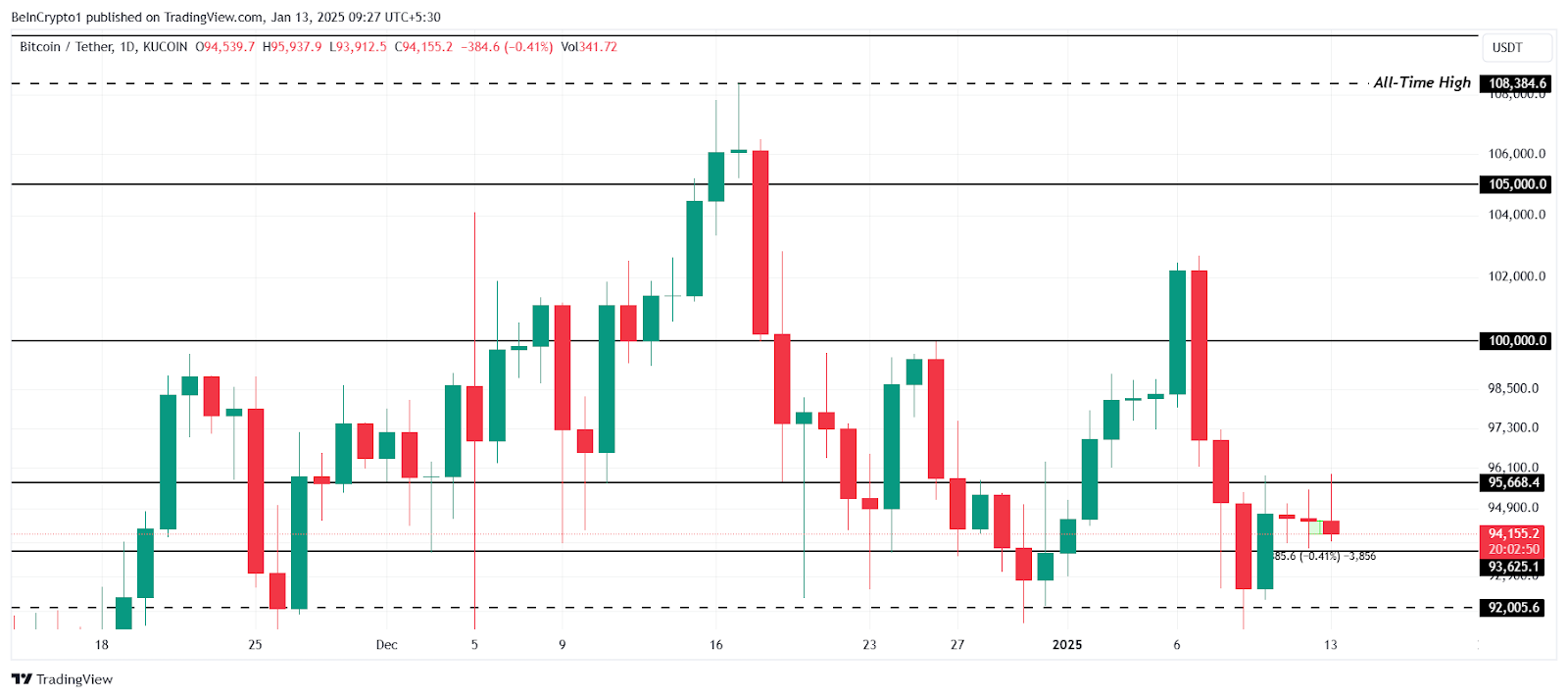 Bitcoin handelt momenteel op $94.155, binnen de kritieke bandbreedte van $95.668 en $93.625. Deze smalle marge benadrukt de moeite van de cryptomunt om uit consolidatie te breken, wat investeerders voorzichtig maakt over de volgende potentiële beweging.