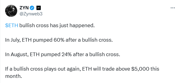 If a bullish cross plays out again,ETH will trade above $5,000 this month.pic.twitter.com/wqfHMH6BH0— ZYN(@Zynweb3)September 17,2025
