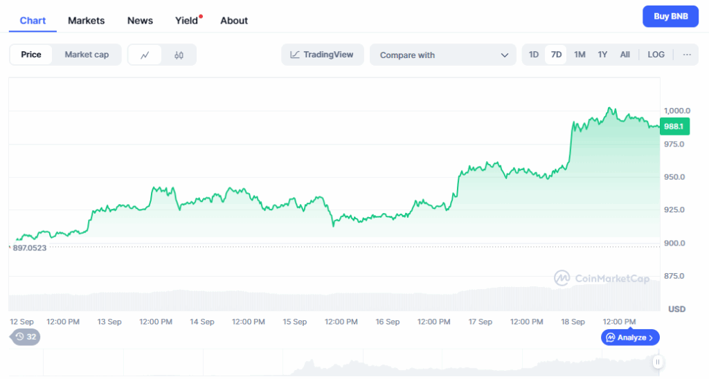 In the early hours of Wednesday, the Binance Coin price rallied to a peak of $956. However, bullish pressure has increased with Binance Coin soaring to a new all-time high of $1,005.