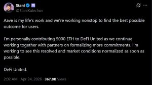 The pledge landed as pressure mounted on the Aave ecosystem following the KelpDAO exploit on April 18, which drained $292 million worth of rsETH through a vulnerability in the protocol’s Layerzero bridge adapter. Aave markets had accepted rsETH as collateral, leaving the protocol exposed to a significant bad-debt shortfall across both its Ethereum and Arbitrum pools.