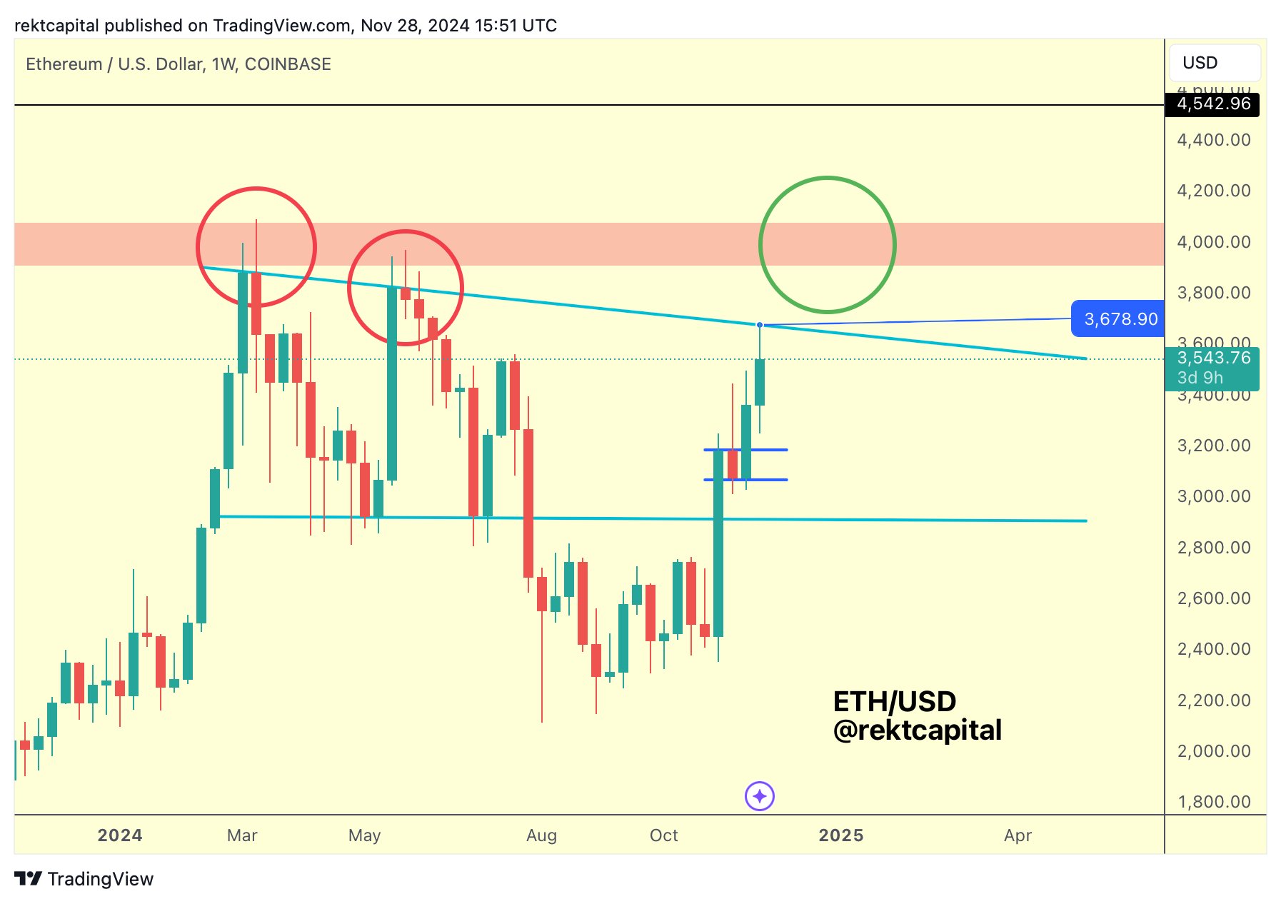 Popular crypto analyst Rekt Capital shows the latest ETH attempt to breach the crucial $3,700 resistance. The analyst added that Ethereum price needs a strong weekly close above this level to confirm a breakout. Only after this, ETH Price rally to $4,000 and beyond can continue.