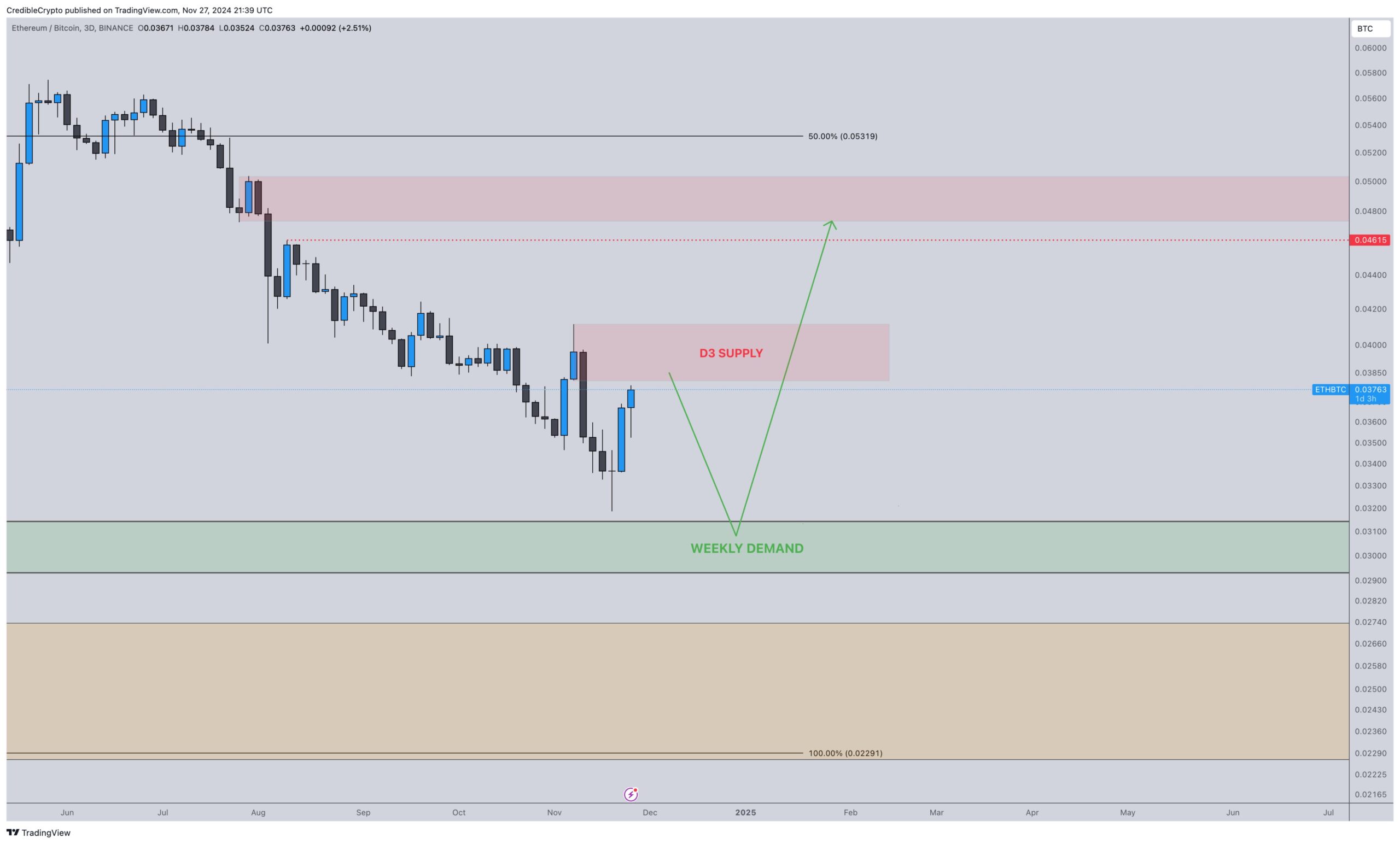 Another popular analyst CrediBULL Crypto points out a critical resistance level in the ETH/BTC pairing. With the recent upward momentum, this pair is approaching the first “trouble area”. The analyst suggests that a rejection at this point, coupled with a potential 10% correction in Bitcoin, could push Ethereum price toward a significant buy zone between $2,700 and $2,800.