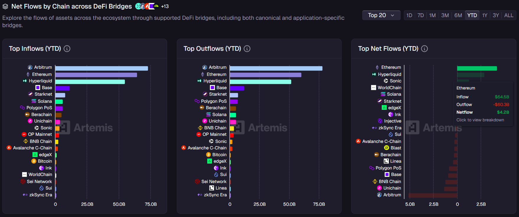 The data measures capital movement across DeFi bridges, including both canonical and application-specific bridges, providing a snapshot of where liquidity is entering and exiting across ecosystems.