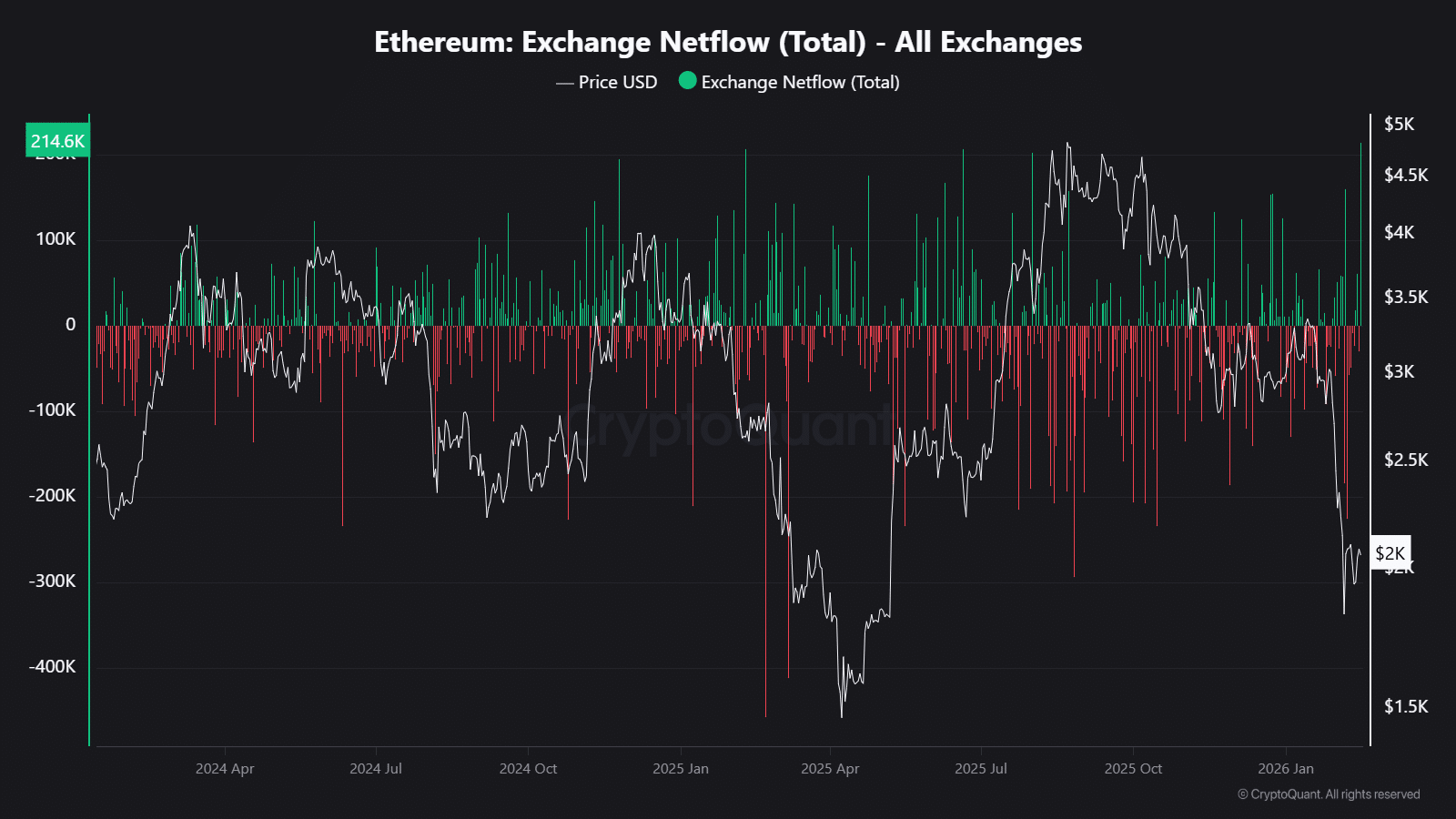 Meanwhile, Exchange Netflows recorded deep negative spikes, including outflows exceeding 214,600 ETH in early February 2026. These sustained withdrawals signaled large holders moving assets off exchanges.