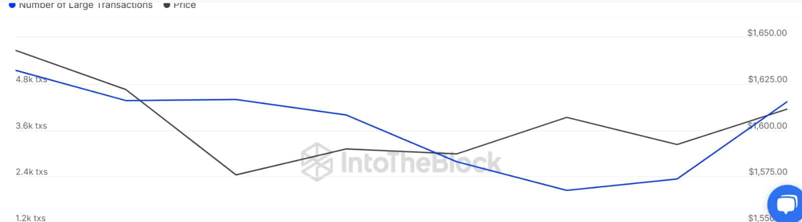 As ETH sees a recovery in interest, large holders have recorded the most activity in the market. As such, large holders’ transactions are on the rise, reaching 4.34k, an increase from 2.33k.