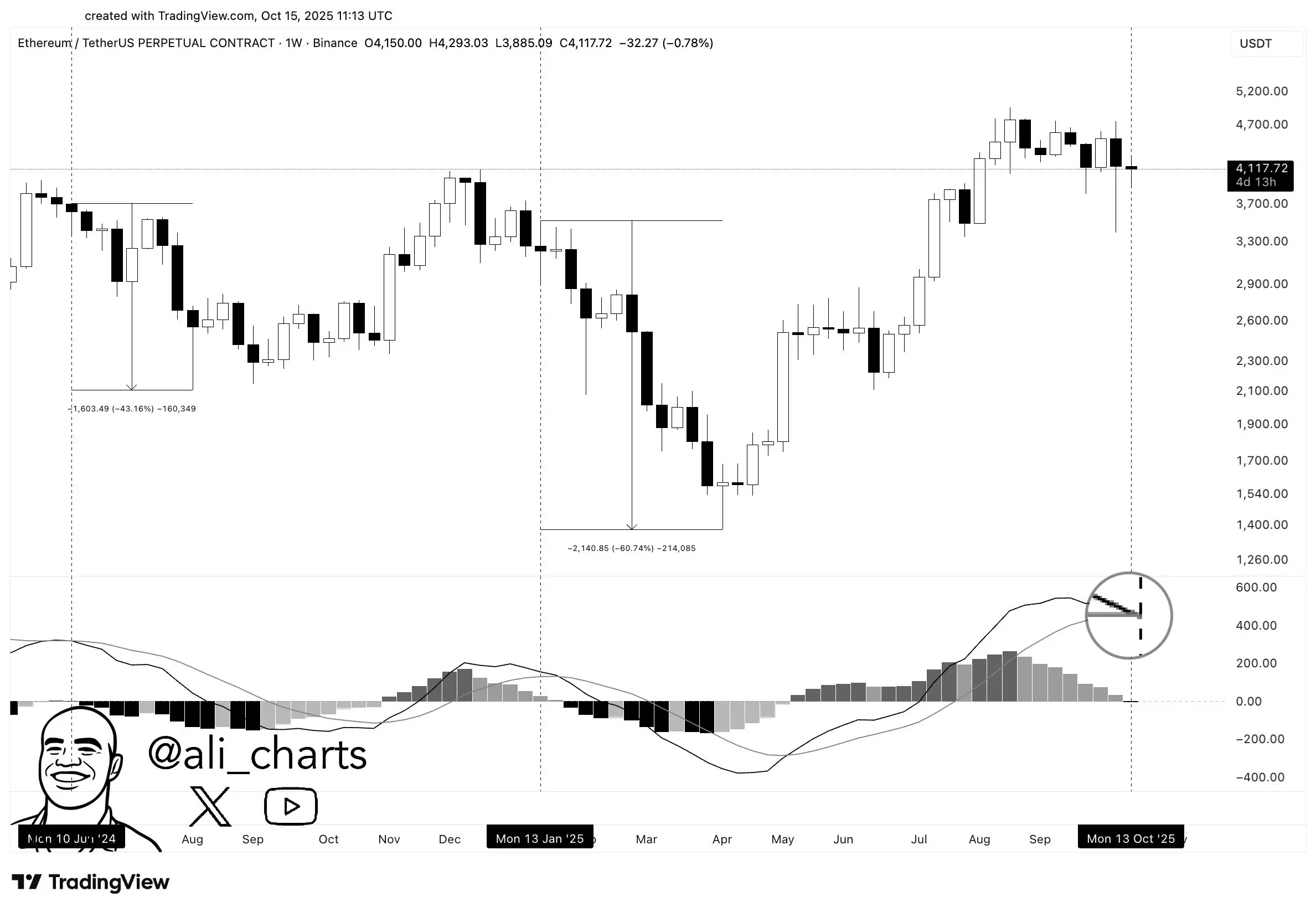 Popular on-chain analyst Ali pointed out that Ethereum’s weekly MACD indicator is nearing a bearish crossover, a signal that historically preceded major declines. In his post, Ali noted that the last two times this pattern appeared, ETH fell 43% and 61%, respectively.
