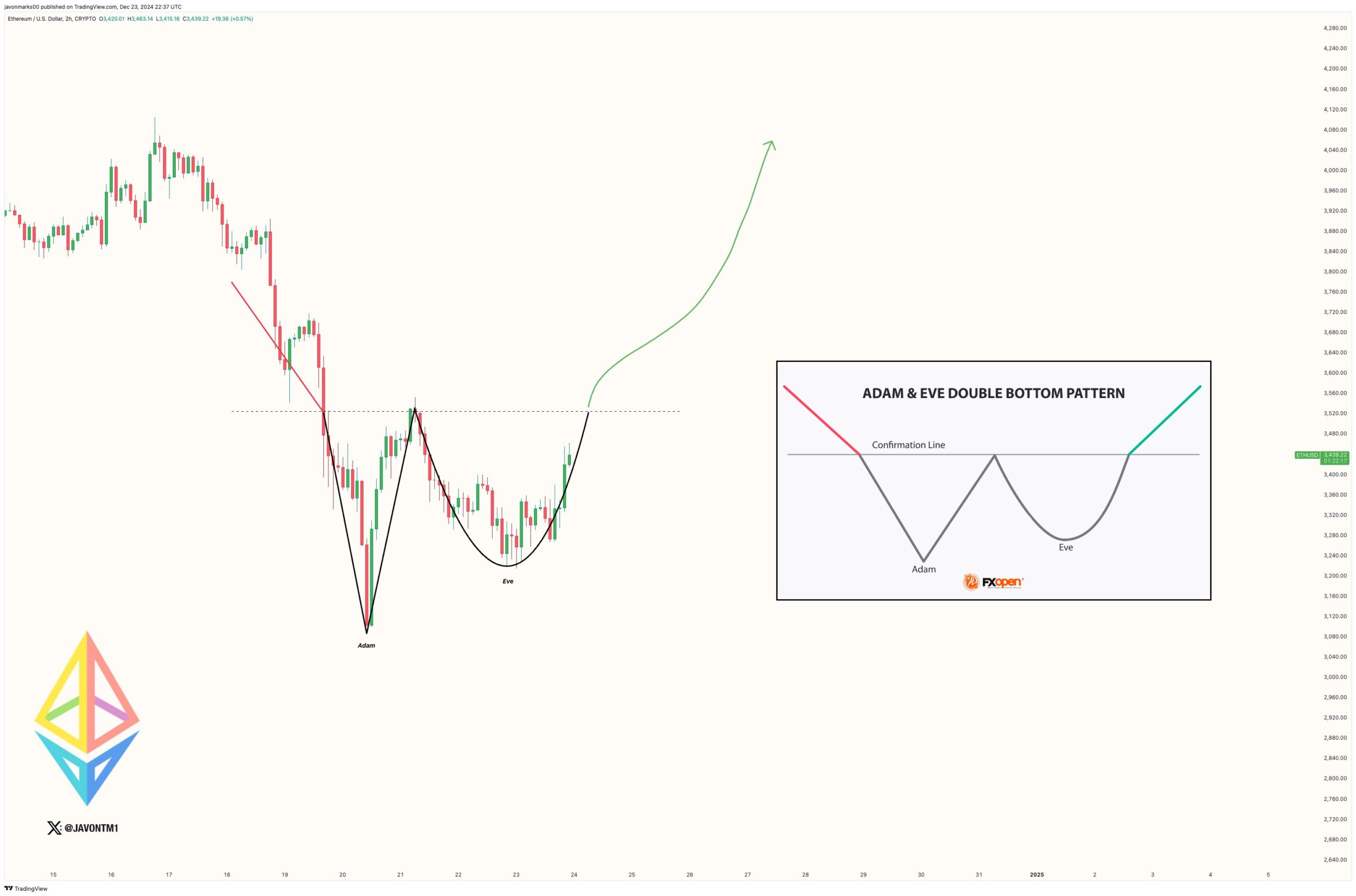Popular crypto analyst Javon Marks noted that the Ethereum price chart is showing an ‘Adam & Eve Double Bottom Pattern,’ suggesting a potential major bullish reversal in the near term, which could drive prices back into the $4,000 range. The primary target for the next move is still above $4,800.