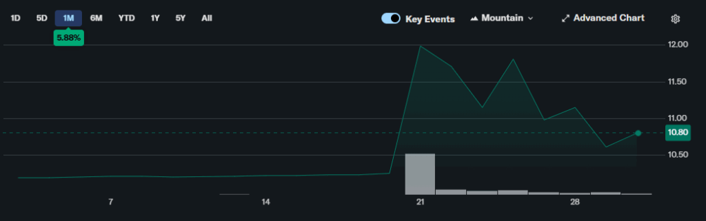 Chart of the price trend of Dynamix Corp shares (NASDAQ: DYNX) during the last month. Source: Yahoo Finance