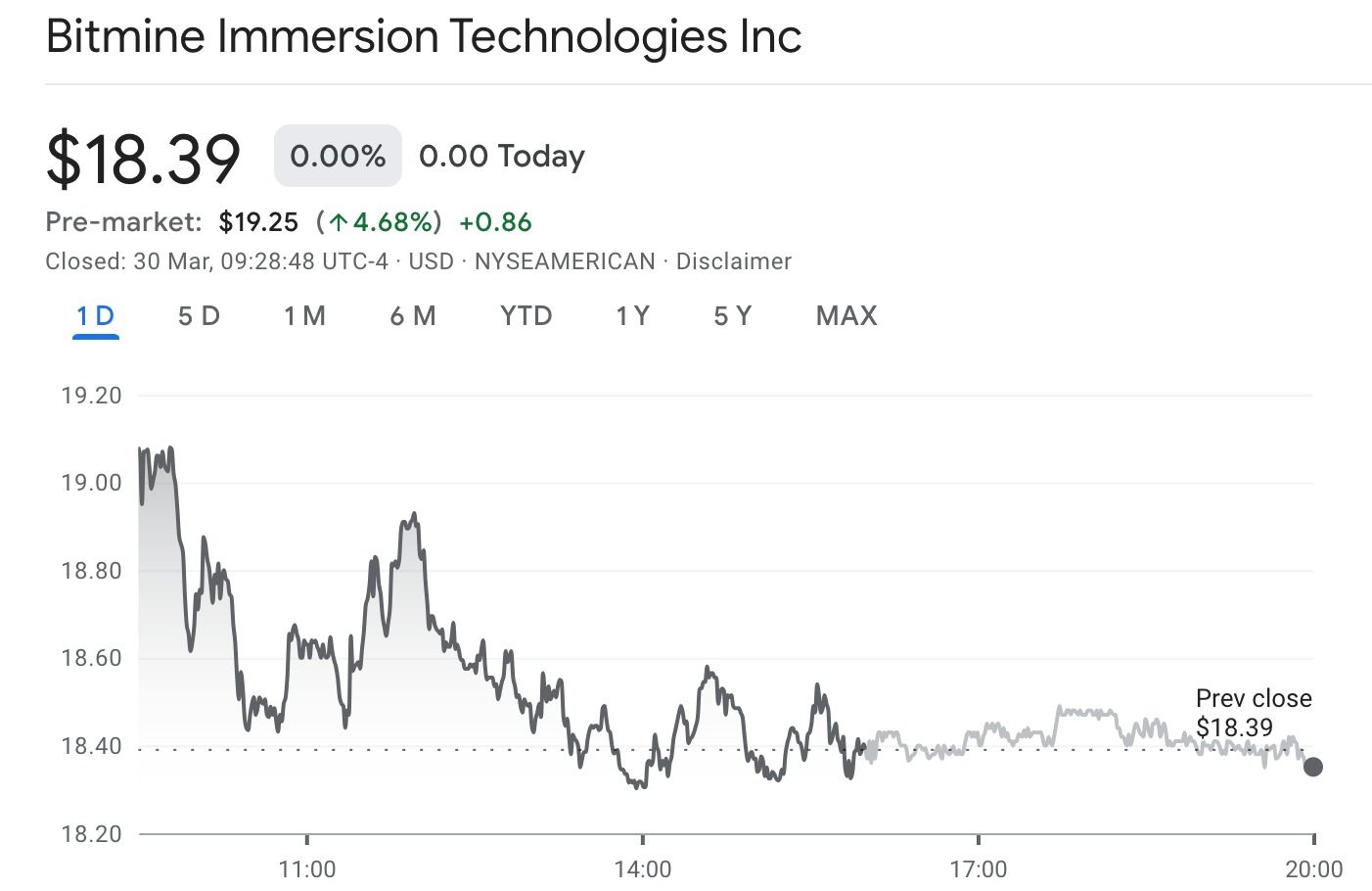 At the time of writing, the BMNR stock traded at $19.25, up by 4.68% or $0.86. This increase follows a Friday close of $18.39.