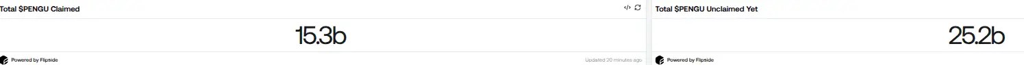 According to FlipsideCrypto data, a total of 15.3 billion $PENGUs have been claimed, with 25.2 billion $PENGU remaining unclaimed. A total of 745,200 addresses have applied for the $PENGU airdrop tokens, accounting for 37.7% of the total airdrop tokens. Note that each eligible address can apply for an average of 20,500 $PENGUs. At the time of writing, PENGU has a market cap of over $1.9 billion and a 24 hour market volume of over 2.1 billion.