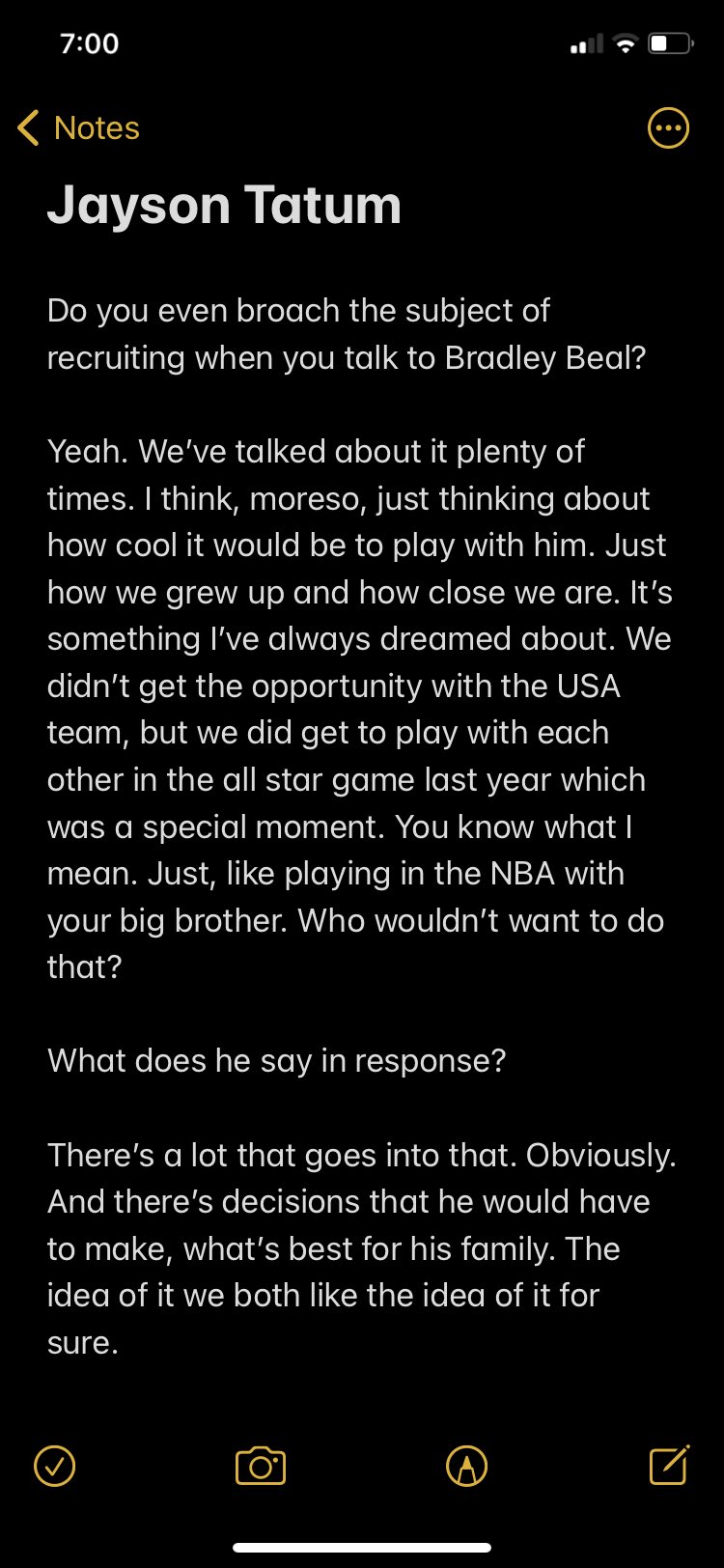 Pressed on how Beal responds to those kinds of conversations Tatum said, “There’s a lot that goes into that. Obviously. And there’s decisions that he would have to make, what’s best for his family. The idea of it we both like the idea of it for sure.”