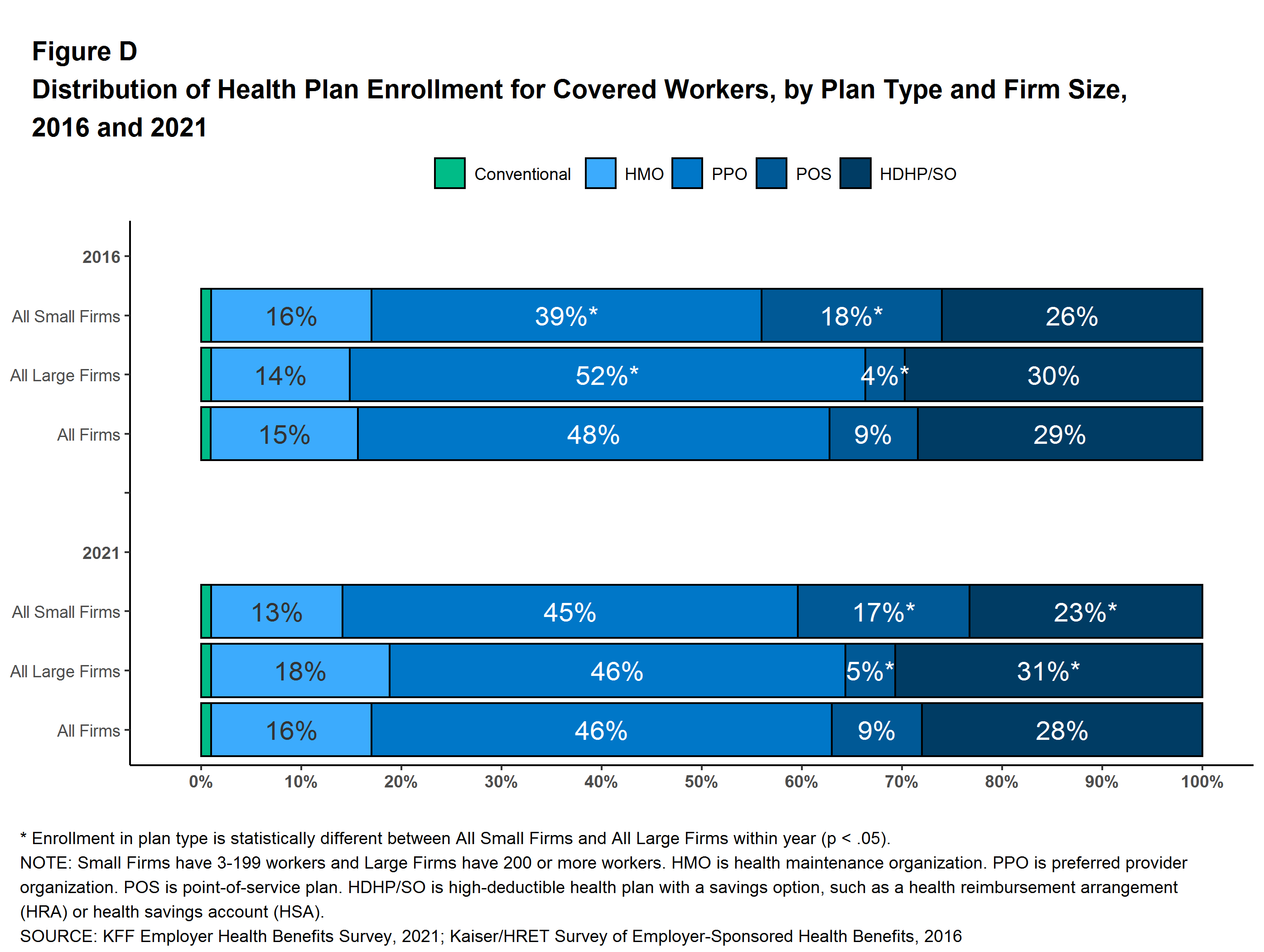 Further, only those with high-deductible health plans can save in an HSA. In 2021, 28% of workers covered by employer-sponsored health insurance were enrolled in a high-deductible health plan with a savings option like an HSA, according to the Kaiser Family Foundation. (Enrollment is a bit higher in large firms with more than 200 workers.)