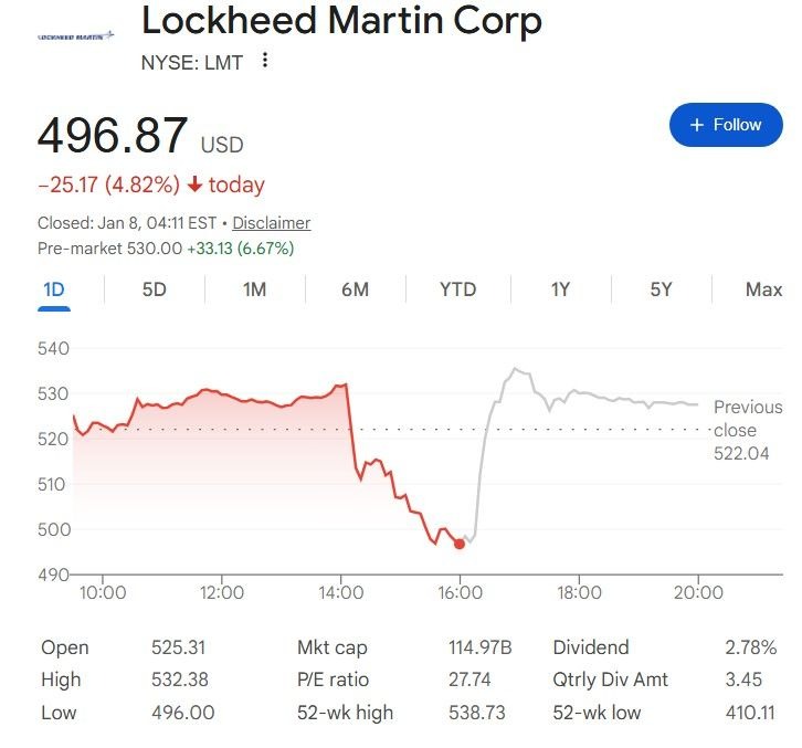 Specifically, the LMT shares first fell 4.82% from approximately $525 to their latest closing price of $496.87 and then rapidly surged 6.67% to $530 in premarket.