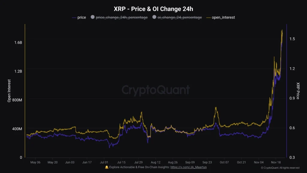 Apparently, XRP’s futures market is blowing up. The open interest (basically how many active trading contracts there are) hit a crazy $2.1 billion, which is a record. That number shows how much people are getting into this, and it lines up with XRP’s price jumping to $1.5—a 180% jump in just a month!
