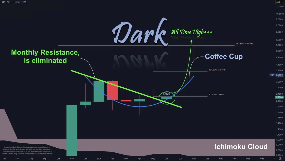 In his latest analysis, Dark Defender points to a bullish breakout from a long-standing downtrend and highlights a forming “coffee cup” pattern, indicating consolidation is giving way to momentum.