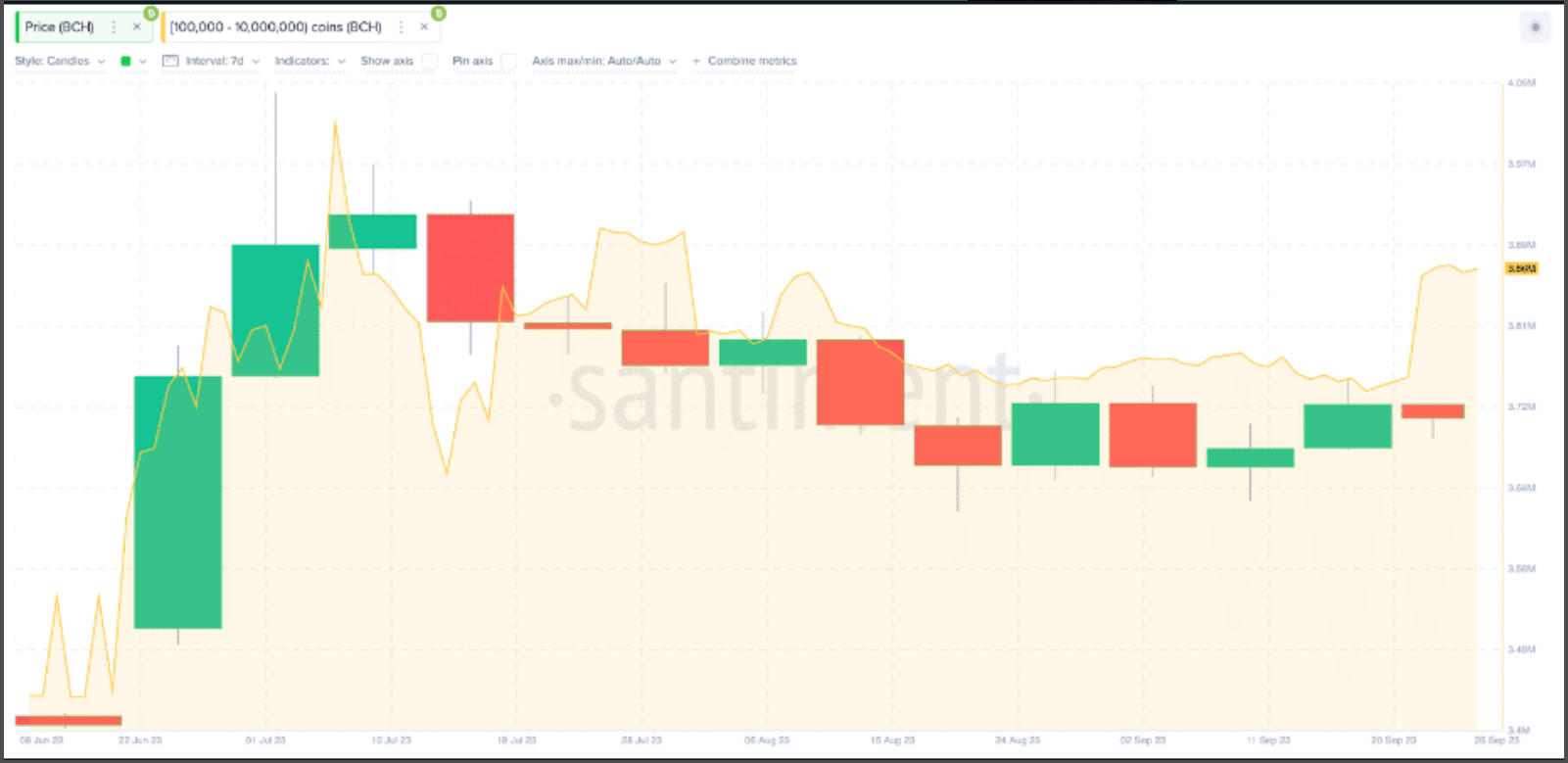 Santiment research indicates that whales in the cryptocurrency space have increased their holdings in Bitcoin Cash significantly. Collectively, bitcoin whales with holdings ranging from 100,000 to 10 million BCH held 3.74 million BCH as of September 18, 2023.