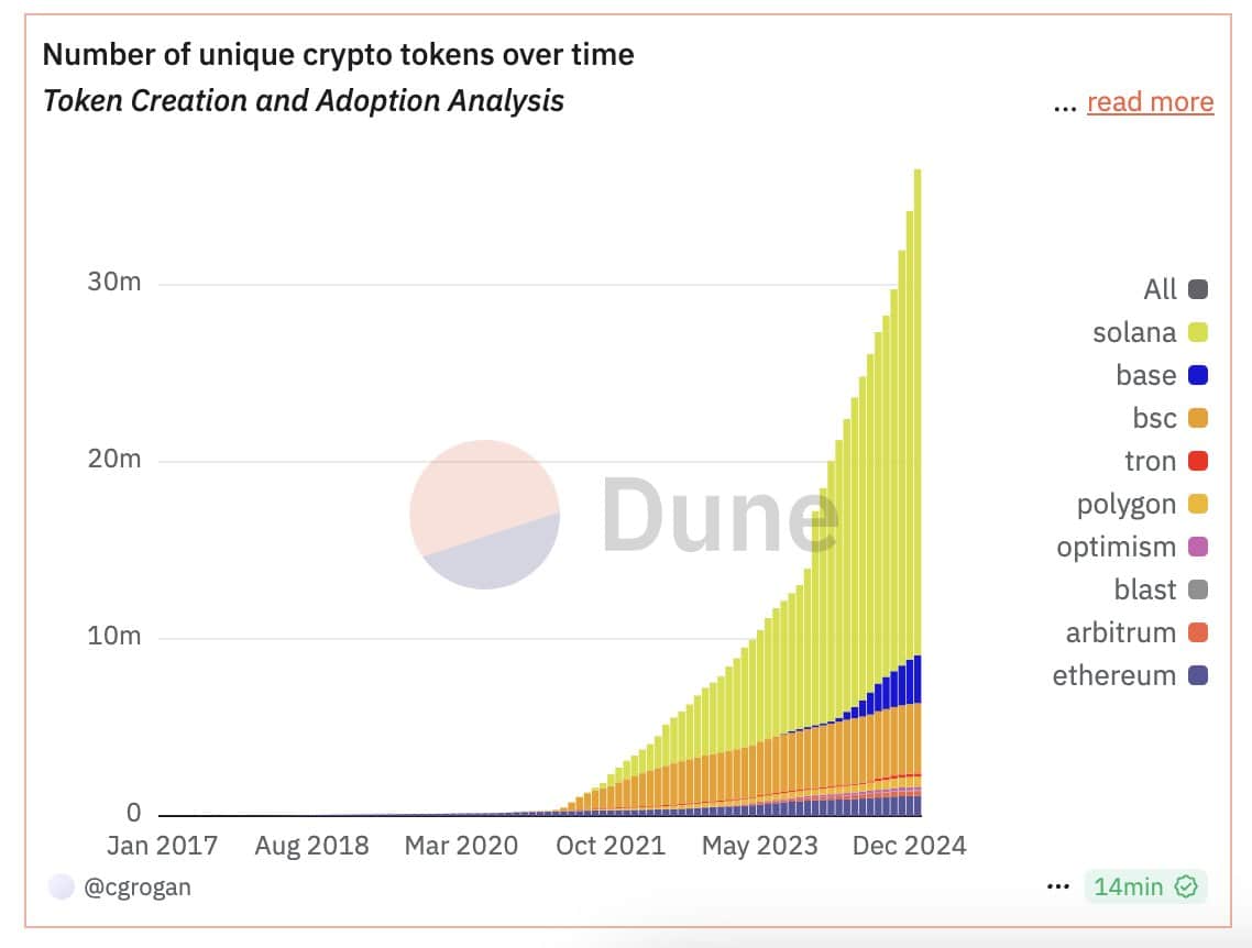While networks like Solana lead in token launches thanks to their low fees and scalability, Ethereum’s slower growth highlights its scalability challenges.