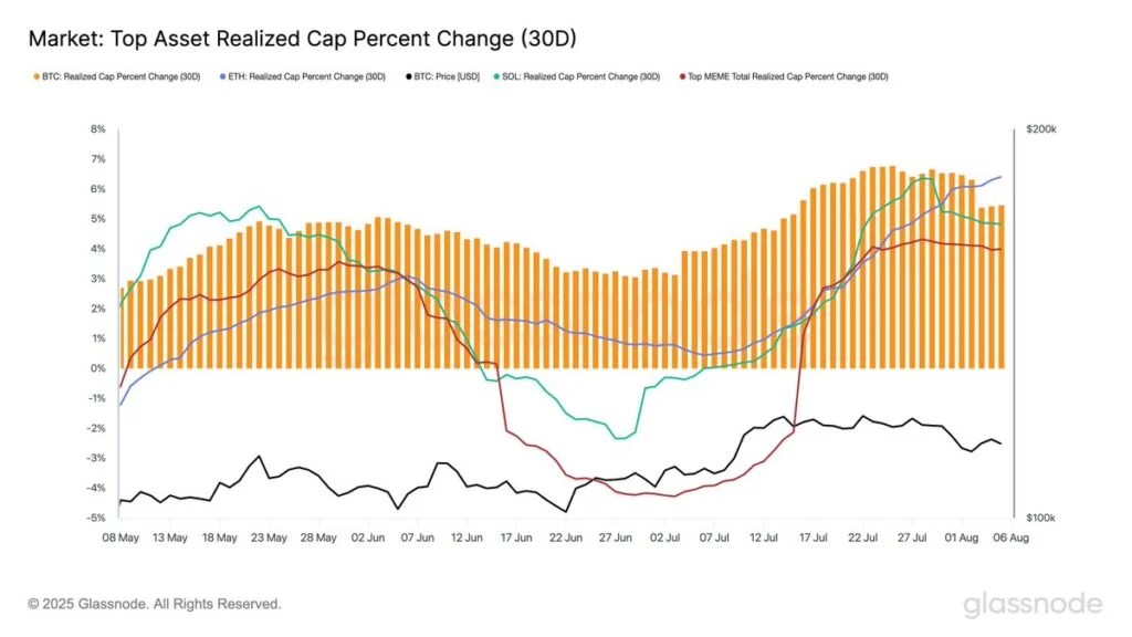Recent Glassnode data shows that Solana’s realized cap growth decelerated from 6.34% to 4.84%. On the contrary, Ethereum’s realized cap growth rate actually went up from 5.32% to 6.41%.