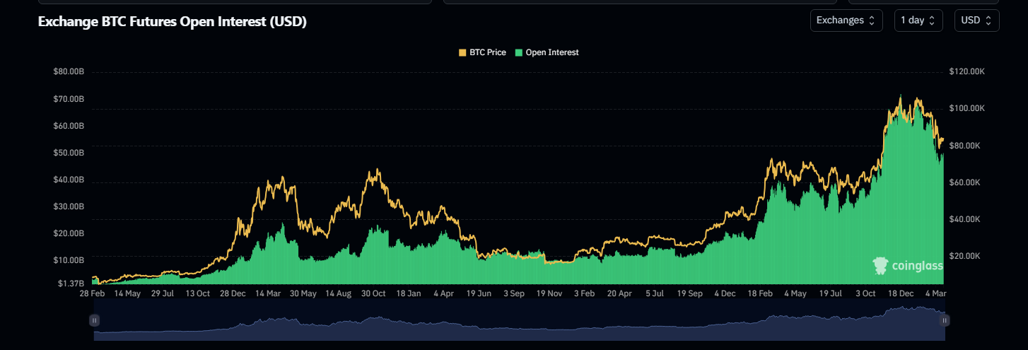 Data from CoinGlass shows that the firstborn crypto’s open interest dropped by 19%, from $61.42 billion to $49.71 billion, citing that the $12-billion shakeout might be a good thing for Bitcoin.