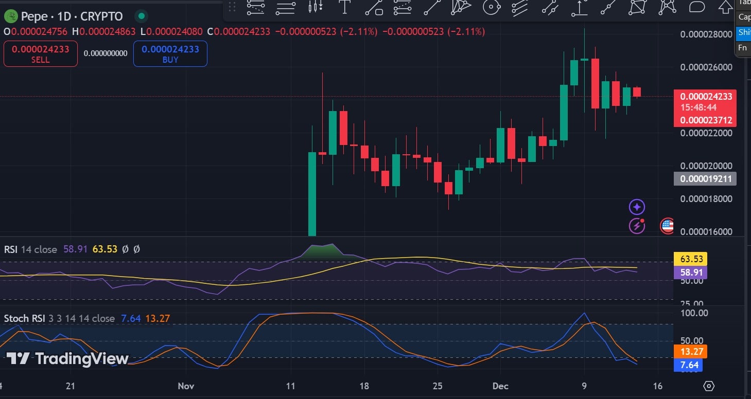 At the time of writing, Pepe was trading at $0.00002423, marking a 3.78% increase on daily charts.