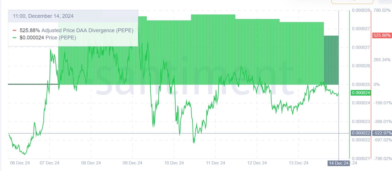 Despite the short-term price weakness, the memecoin’s Adjusted Price DAA Divergence remained positive over the past week. This indicates that fundamental metrics such as network activity are improving. Therefore, this divergence signals potential price growth in the near term.