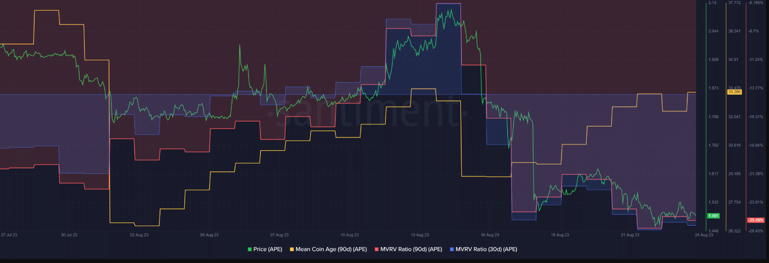 Meanwhile, Santiment’s data revealed an interesting statistic. Apecoin investors have suffered significant losses, with the Market Value to Realized Value (MVRV) ratio falling by -15.90% and -25.49% for monthly and quarterly holders, respectively.