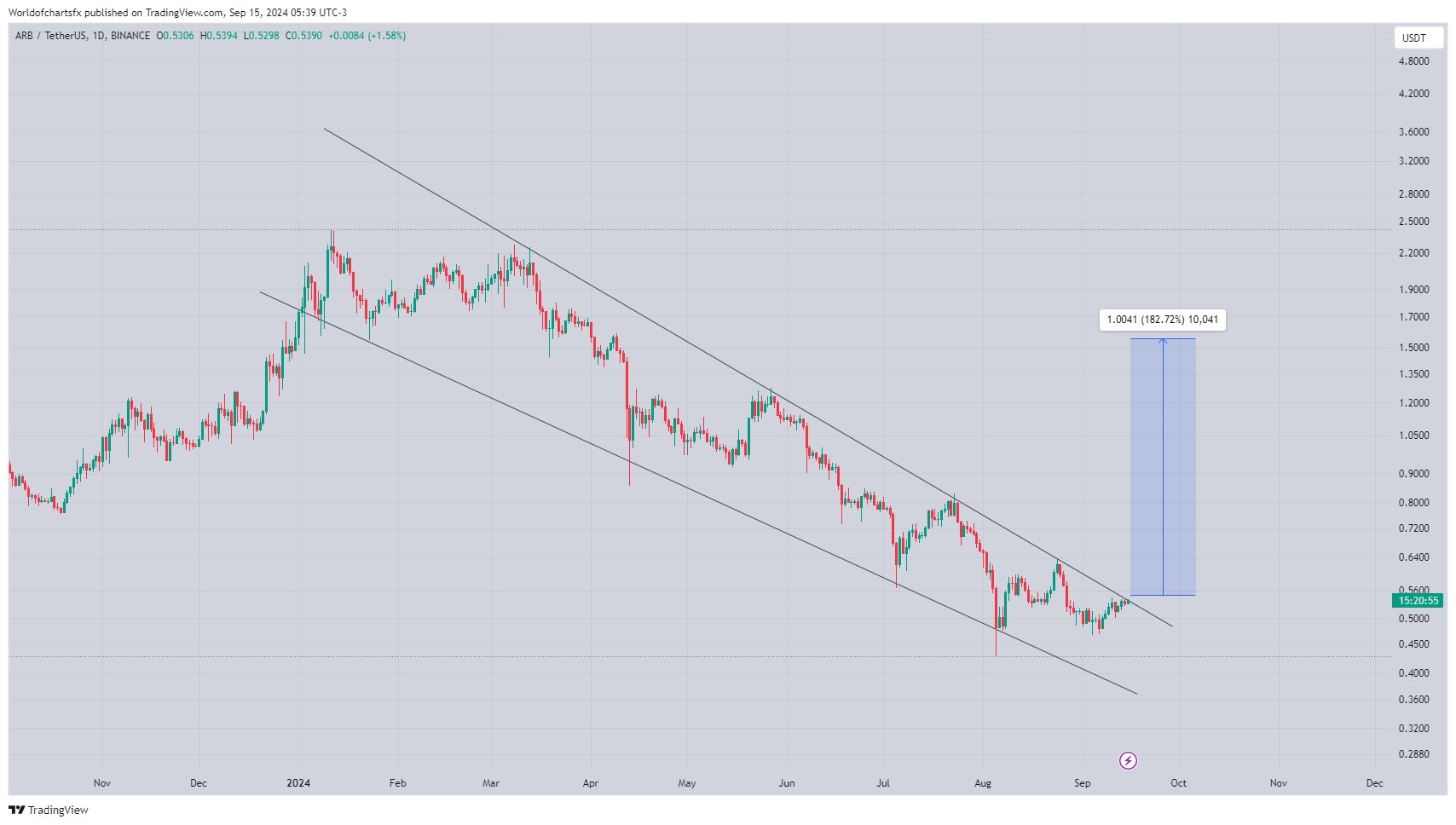 According to a recent analysis, the price of ARB could rise to approximately $1.50 if a breakout occurs. This projection marked a potential 182.72% increase from its current value of $0.5082.