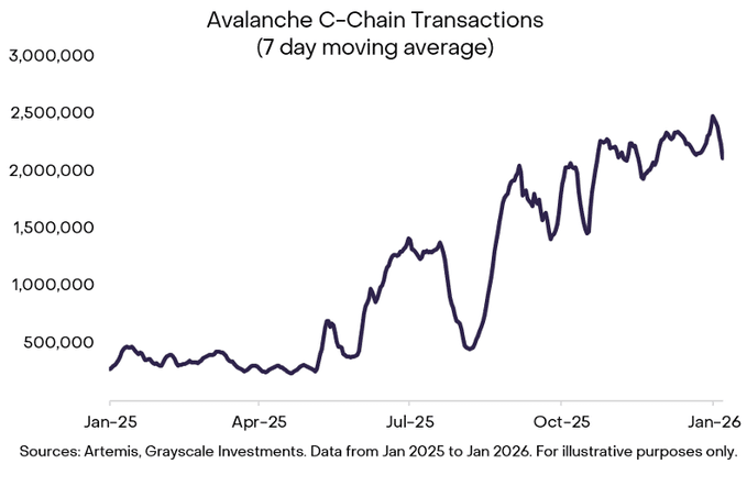 Grayscale observed that Avalanche’s C‑Chain gained momentum in late 2025, averaging 2.5 million on‑chain transactions over seven days. This growth highlighted the network’s long‑term strength and reflected increasing interest from both developers and users.