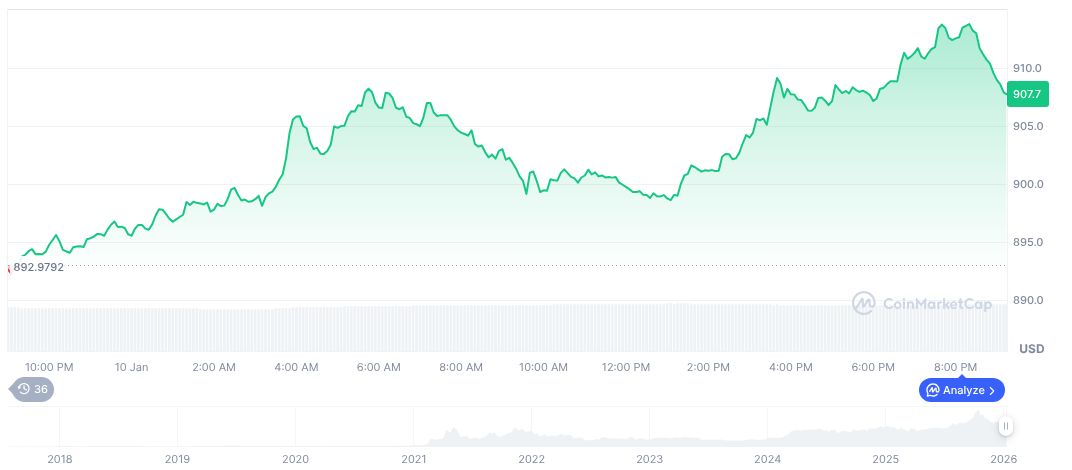 As of January 11, 2026, BNB’s price stood at $910.20 with a market cap of $125.37 billion, according to CoinMarketCap. Trading volume over the last 24 hours was $1.86 billion, reflecting a modest price gain of 0.25%. Recent statistics display a complex set of changes over various time frames.