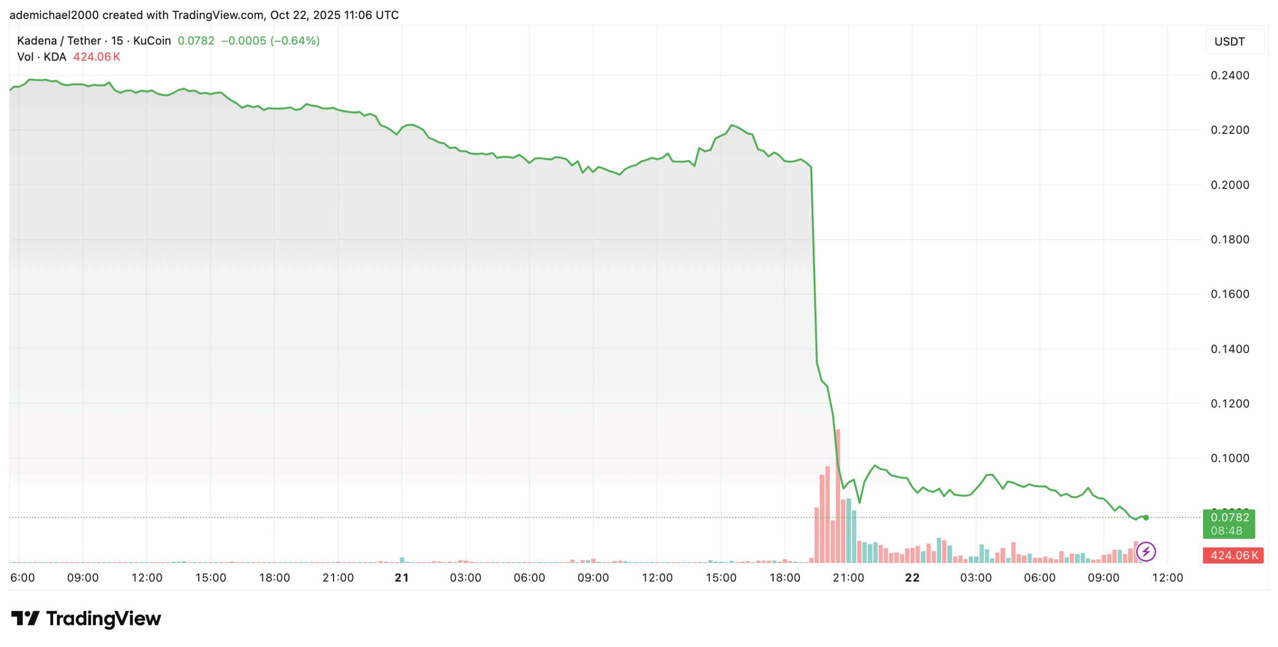 The Kadena token crash reflects years of declining traction. After reaching an all-time high of $27.64 in 2021, the KDA price has now collapsed by over 99%. The coin plunged to $0.089 in the past 24 hours, a 60% single-day drop following the shutdown announcement.