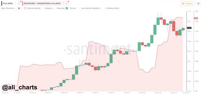 - Whales acquired 130M ADA at $0.30, reinforcing support and fueling a rally toward $1.00.