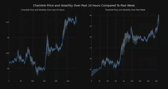 The chart below compares the price movement and volatility for Chainlink over the past 24 hours (left) to its price movement over the past week (right).