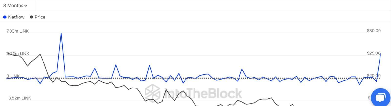 According to IntoTheBlock, LINK has seen consistent outflows from exchanges over the past month, hinting at ongoing accumulation. Net outflows have surpassed $120 million worth of LINK in the last 30 days.