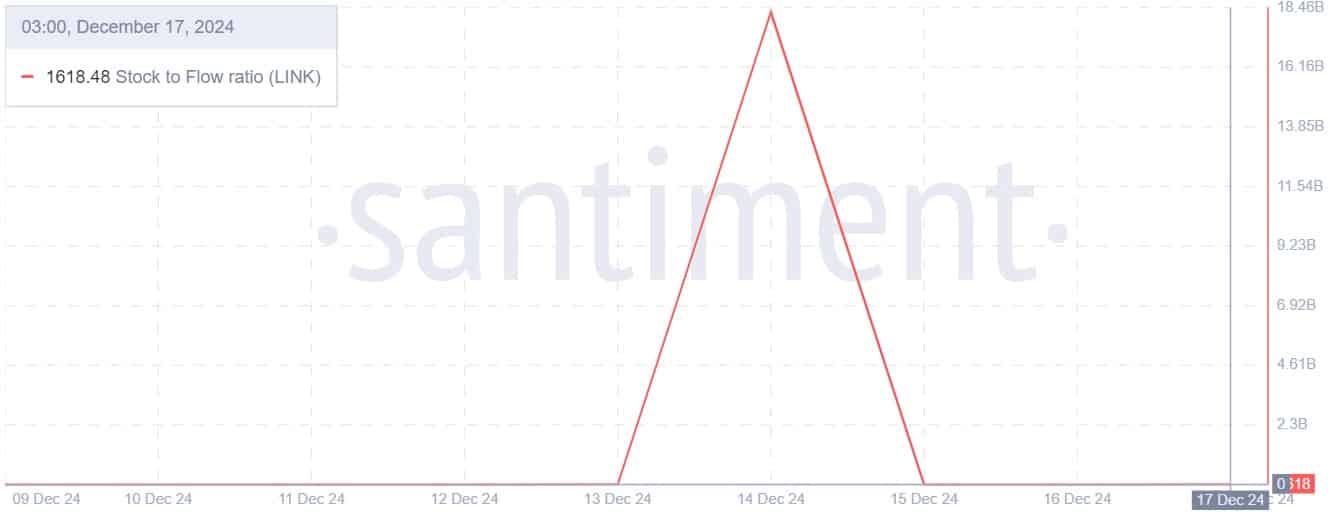 Accordingly, Chainlink’s SFR has spiked from 0, indicating oversupply, to 1618.48. This rise suggests increased scarcity, prompting hoarding or accumulation among investors and reducing market liquidity. A drop in liquidity can drive prices up if demand outpaces supply.