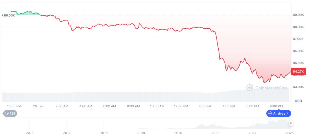 Bitcoin’s market indicators reflect fluctuation, trading at $84,466.47 with a market cap of $1.69 trillion, as per CoinMarketCap figures as of January 29, 2026. Notably, Bitcoin experienced a 5.39% price reduction over the past 24 hours, with a 22.9% decrease in a 90-day interval, mirroring broader market conditions. Recent data shows a 7.49% fall over 60 days, with a current circulating supply of 19,982,062 BTC.