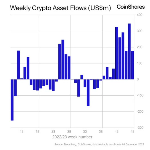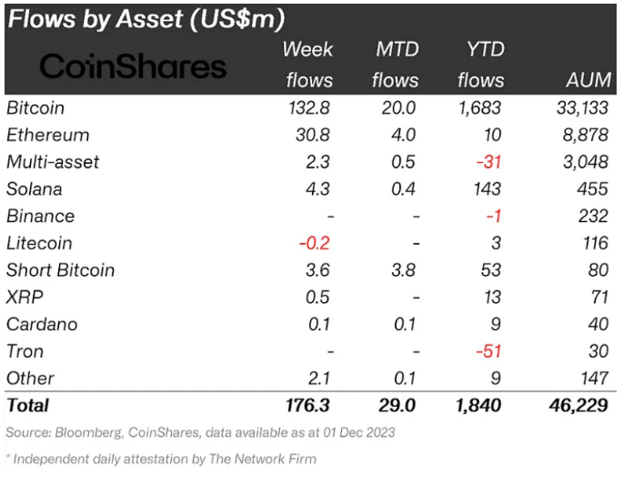 Based on CoinShares data, as of November statistics, year-to-date inflows have reached $1.14 billion, which is the third-highest amount ever. Simultaneously, the total assets under management increased by 9.6% last week and by 99% since the year 2023 began.