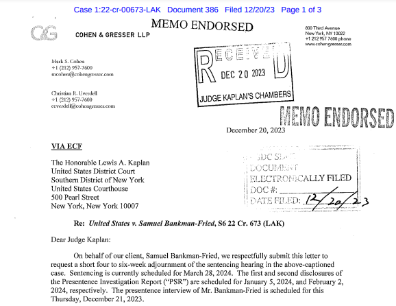 Attorney Mark Cohen of Cohen & Gresser submitted a letter on December 20th, requesting a postponement of the sentencing hearing slated for March 28, 2024, and his presentencing interview scheduled for Thursday, December 21st.