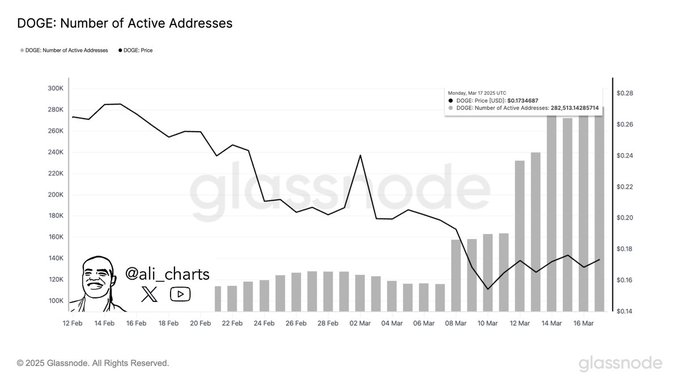 Despite the bearish signals, Dogecoin’s network has shown increased activity. According to crypto analyst Ali Martinez, there has been a notable surge in active addresses, rising from 150,000 on the 12th of March to over 280,000 by the 14th of March.