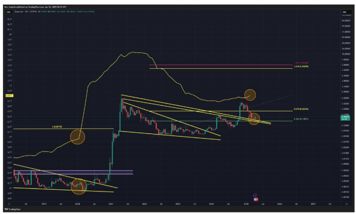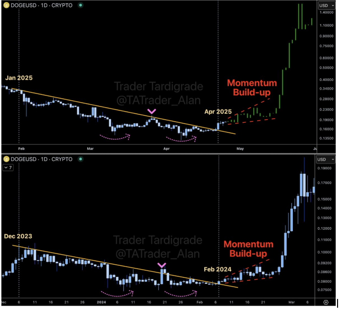In line with this, he asserted that if the Dogecoin price performs a similar buildup, then a massive surge could happen in May 2025, with the meme coin surpassing the $1 mark. His accompanying chart showed that DOGE rallied from around $0.09 to as high as $0.18 the last time it witnessed a similar momentum buildup.
