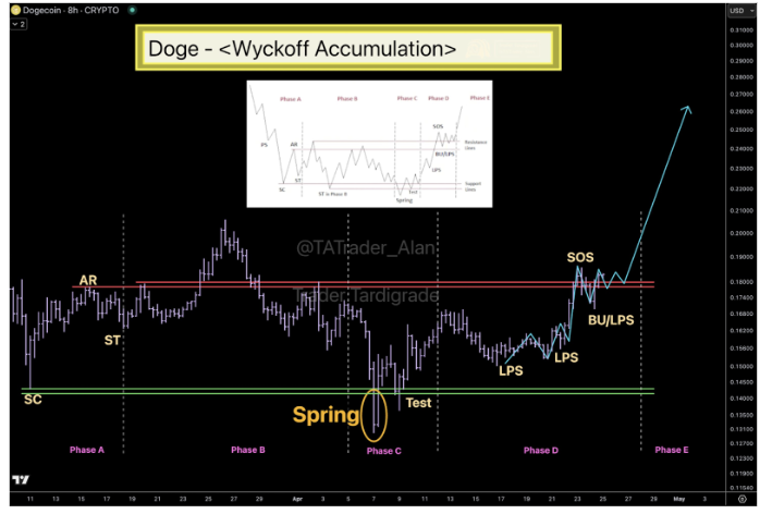 Meanwhile, phase D featured several low points of support (LSPs), signs of strength (SOS), and back-ups (BU). He added that once Dogecoin consolidates around the $0.18 range for a while, it will enter phase E to complete the pattern and launch a massive rally for the meme coin. The Dogecoin price is expected to reach $0.26 in phase E before it rallies to new highs.