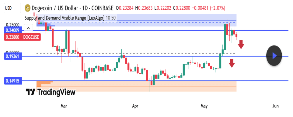 The retreat is a resulting effect of Dogecoin failing to break through a key supply zone between $0.24009 and $0.25000, which is an area that previously triggered a strong rejection in early March. Notably, a technical analysis of Dogecoin’s price action on the TradingView platform suggests that bears are slowly taking over.